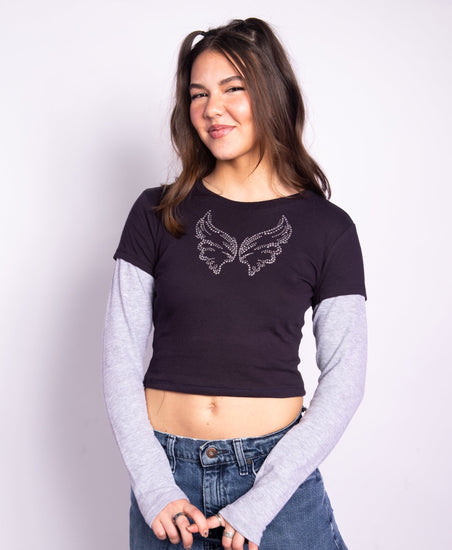 major girl next door vibes. this cozy layered tee features thermal sleeves and the cutest angel wings rhinestone embellishment.