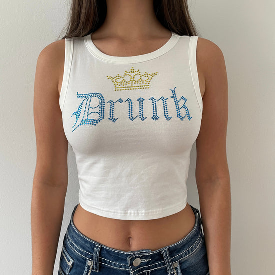 the PERFECT girl's night out tank! Features rhinestones that spell out DRUNK in a Corona Beer style font. all you need now is someone to get you free drinks ;)