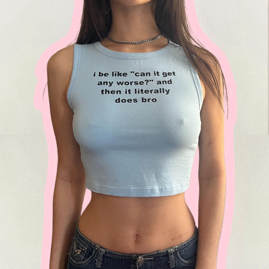 iconic slogan tank top that reads "i be like "can it get any worse?" and then it literally does bro" ... your dreams just came true and now you can be a walking sh*t post with this stretchy light blue tank top