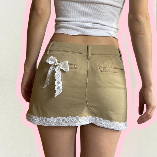 cutesy handmade khaki coquette mini skirt with lace ribbon and rose details!
