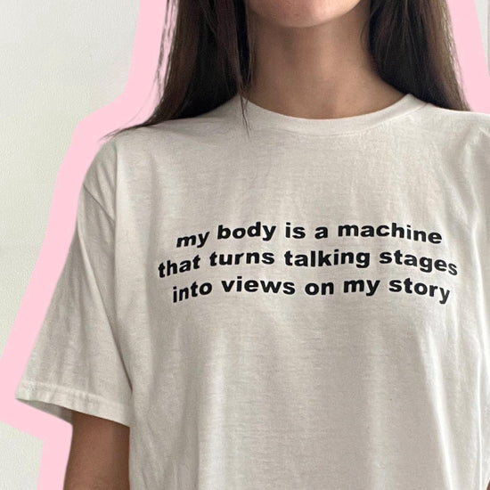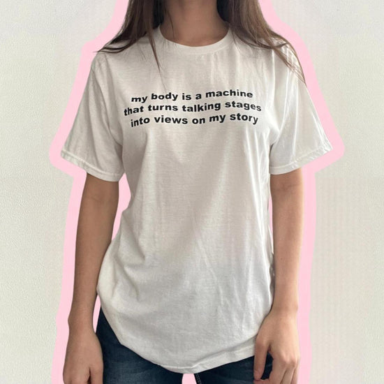 white slogan oversized tee that reads "My body is a machine that turns talking stages into views on my story.” be you’re own walking sh*t post. soft unisex cotton t-shirt!