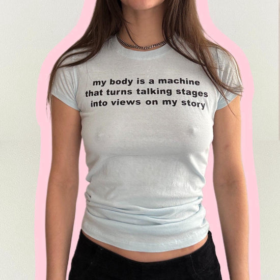 light blue slogan long baby tee that reads "my body is a machine that turns talking stages into views on my story.” be your own walking sh*t post. soft cotton cap sleeve, full length baby tee!