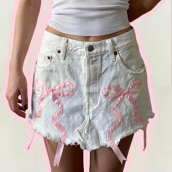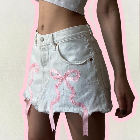 The mini skirt of your dreams featuring the cutest pink ribbon bows! Reworked from second-hand Levi's so it is a sturdy denim!